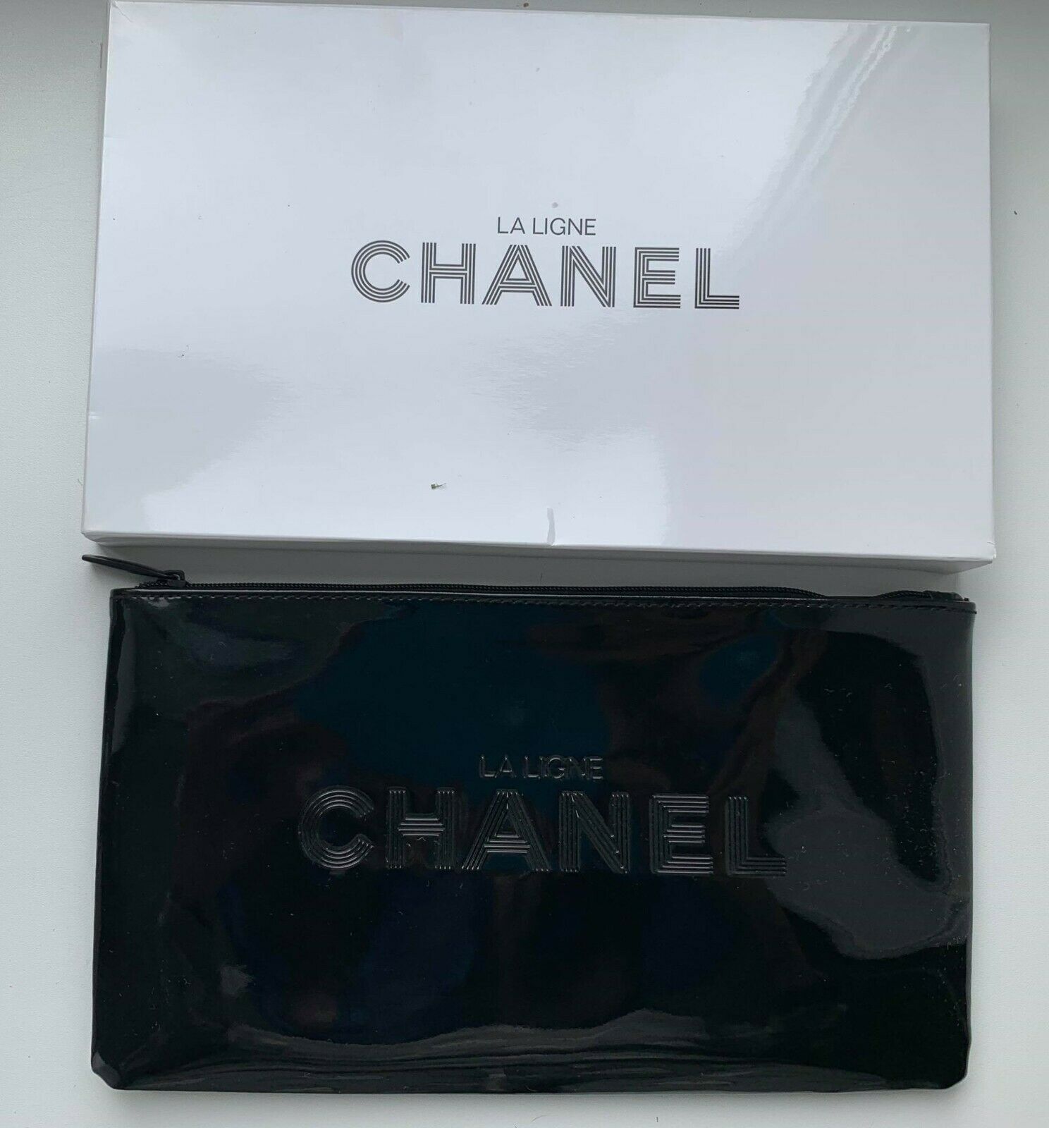Chanel LA Ligne chanel Black Patent Makeup Pouch bag in Box